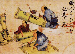 中国伝来のものが多い中で、畳は日本固有の敷物です。その歴史は「菅畳八重」「皮畳八重」などの記事がある古事記にまでさかのぼります。 まだ畳床などはなく、コモなどの敷物を重ねたものと推測されます。現代の畳に似た構造になったのは平安時代。板敷に座具や寝具として敷くという使い方で、使う人の身分によって畳の厚さやへりの柄・色が異なりました。 |